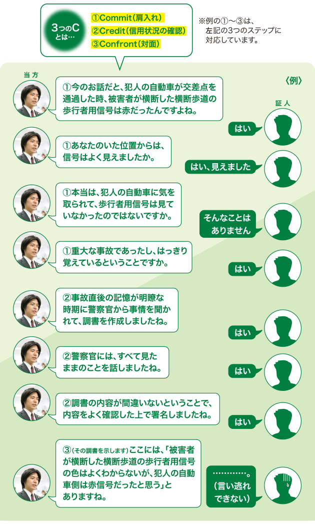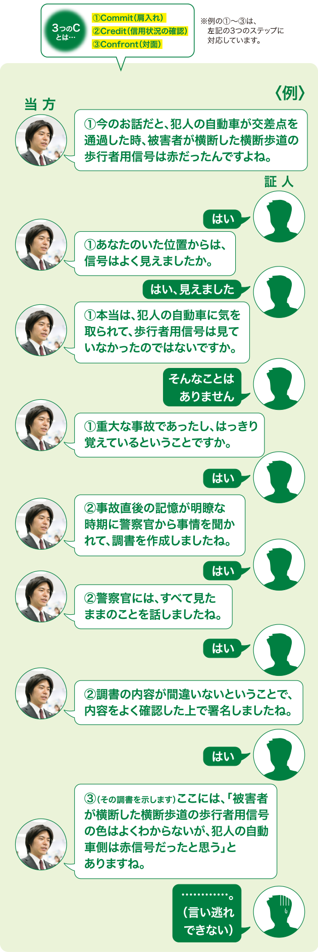 この例では、①から③をこの順序で行ったのでうまく行きました。でもどこかのステップを省略してしまったり、順序を間違えたりすると、失敗する可能性がぐっと上がってしま います。 例えば、①の後、②を省略して、先に③を持ってきてしまい、「調書では被害者側の歩行者用信号の色はよくわからないと記載されていますがどうしてですか?」などとやってしまうと、「警察官には話したが、警察官が間違えたと思う」だとか「警察官に話したときには自分も勘違いしていた」とか言い逃れをされてしまいます。